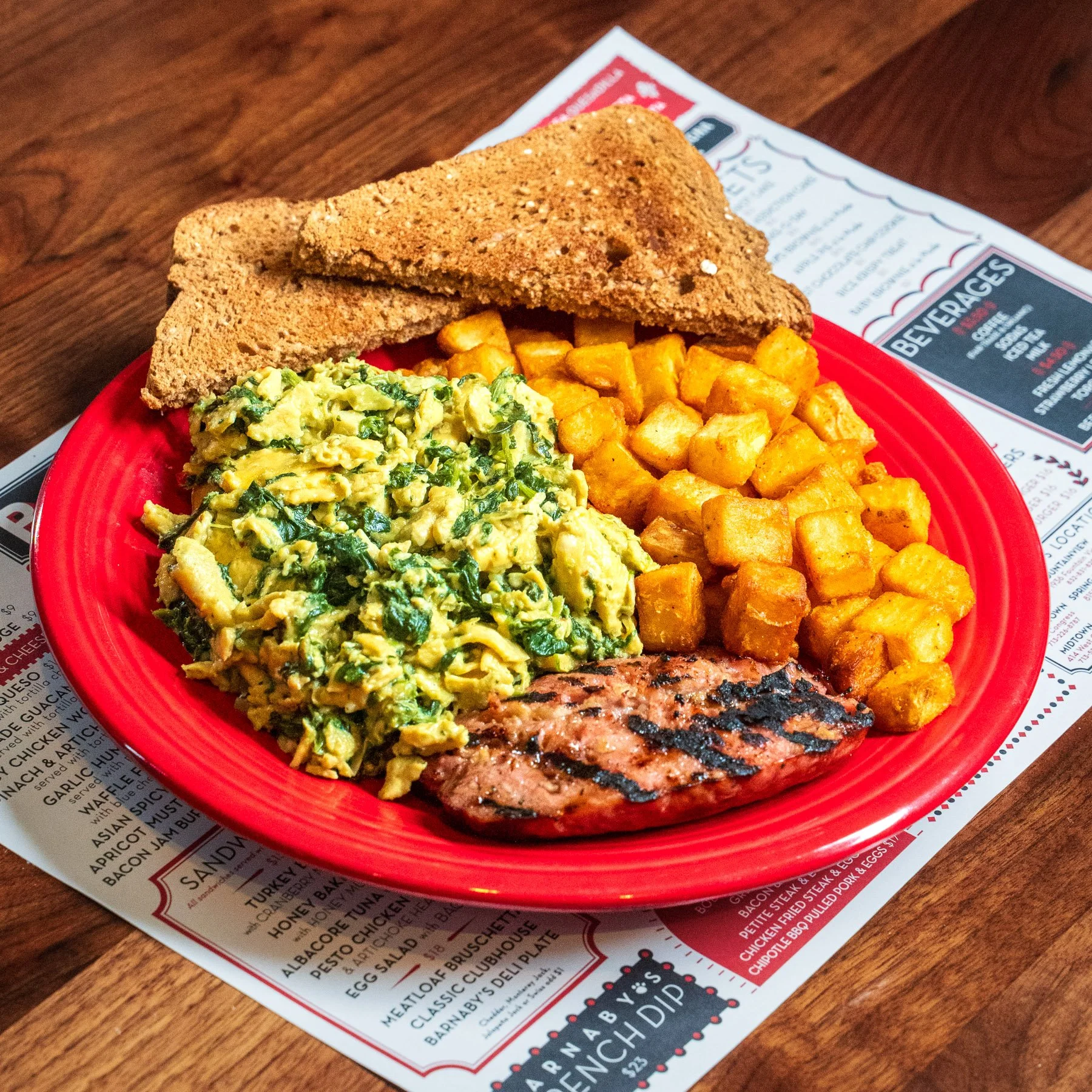 Farm fresh eggs scrambled with a mild spicy/savory blend of spinach, artichoke hearts, two cheeses and bit of cream. Served with Adell”s chicken apple sausage, cubed seasoned breakfast potatoes & dry wheat toast.