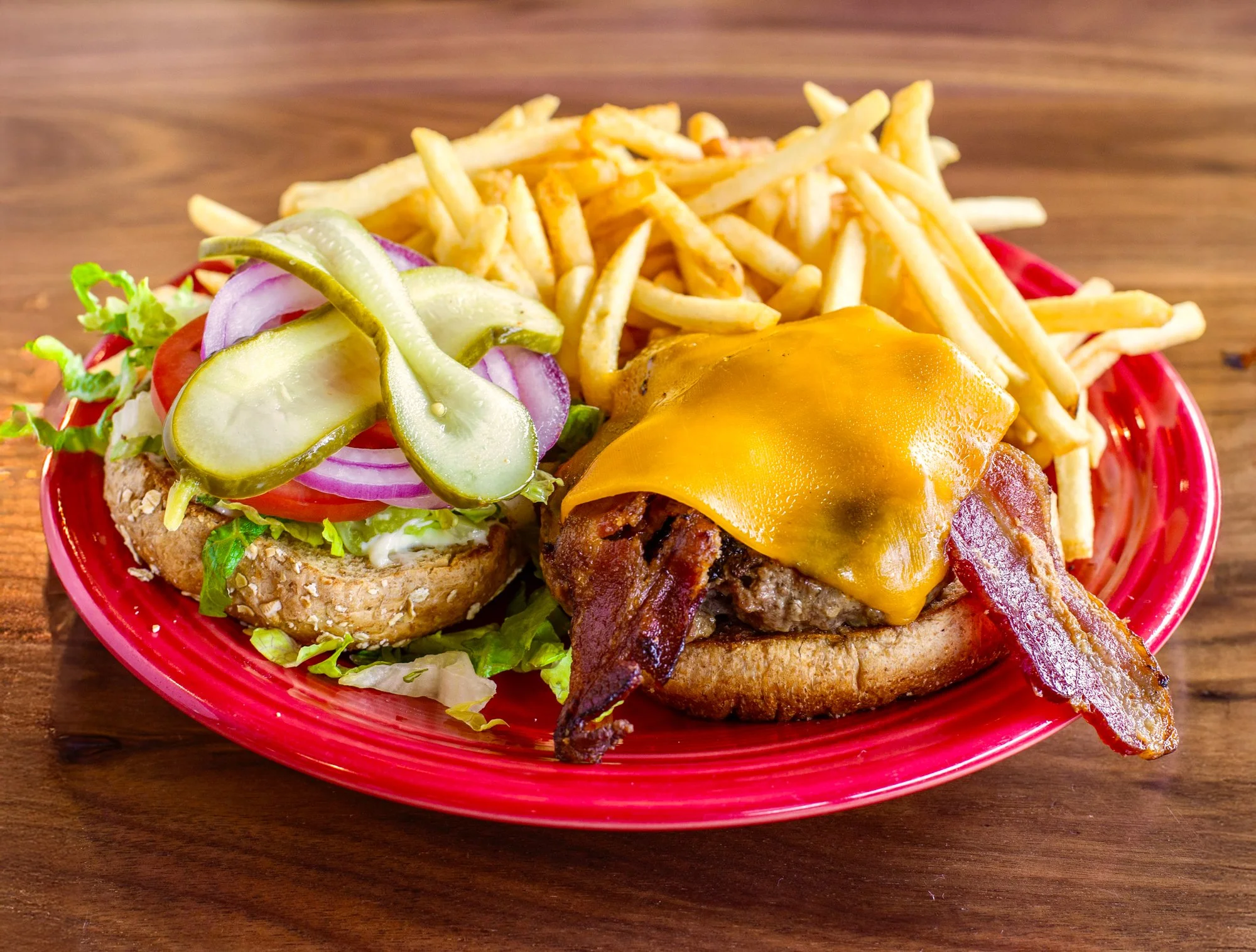 All Natural Ground Round steak patty topped with Monterey Jack cheese, shredded cheddar cheese, diced tomatoes, scallions & a side of BBQ sauce. Served with crispy shoestring fries. Cooked to requested temperature.